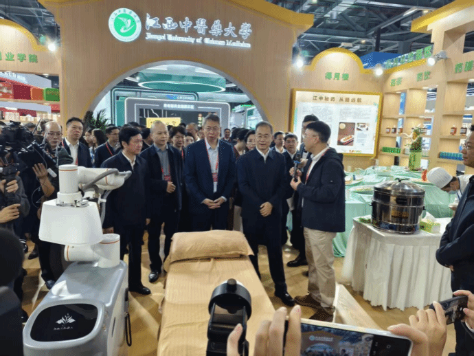 在江西中医药大学展区,孙洪山详细听取了学校在中医药传承创新发展方面的工作汇报,重点考察了热敏灸机器人和药膳等成果。孙洪山对学校服务我省银发经济发展的贡献给予充分肯定,并鼓励学校充分发挥中医药的优势,积极推动科技成果转化为适老化、可推广的民生服务产品,切实满足老年人多样化、多层次、高品质的养老服务需求,为加快推动银发经济高质量发展贡献高校力量。